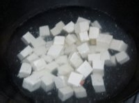 3.锅中加入水和少量的盐,下入豆腐块烧开煮至2分钟后捞出沥干水分。