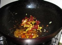4.锅中注油,下入辣酱煸炒出红油后下入葱姜炒香。