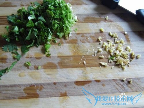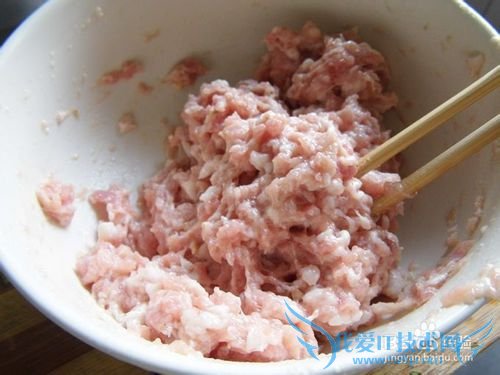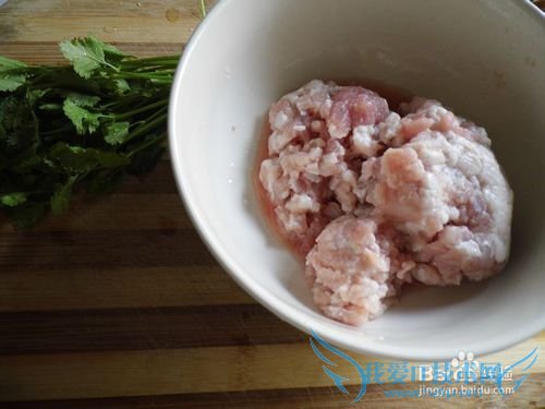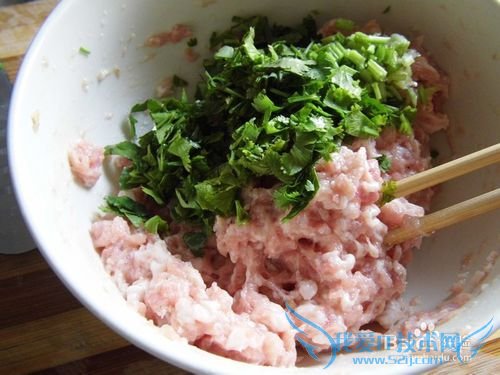 剁细的香菜和姜末加入肉糜中,由慢变快的顺时针搅拌,直到肉糜上劲