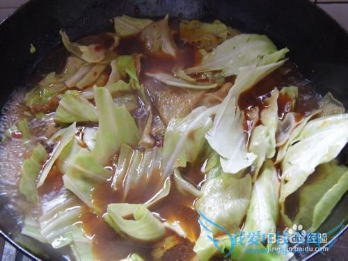 水煮开后,先下入大白菜片煮熟,煮熟的白菜片捞出铺入器皿中