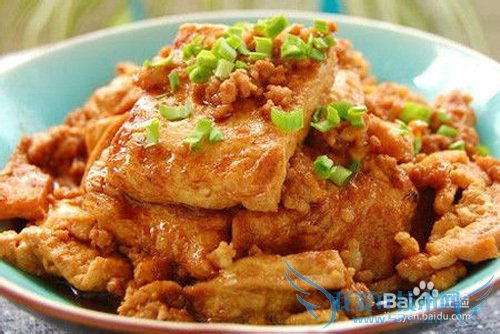 做法:1、老豆腐切片,瘦肉剁碎成肉末,加入少许干淀粉抓匀;郫县豆瓣酱剁碎,生姜与大蒜切成末,葱切花; 2、热锅放油,将豆腐逐片放入,煎至两面金黄后舀出待用; 3、锅内再加入少许油,下入肉末炒到变色; 4、放入干黄酱、郫县豆瓣酱、姜蒜末,炒匀后加入约100毫升水; 5、下入先前炒好的豆腐,炒匀后煮5分钟; 6、加入少许鸡粉炒匀,再放入葱花、倒入湿淀粉炒匀即可。