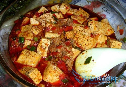 材料:豆腐 400克、牛肉绞肉100克、豆豉5颗、葱花1茶匙、姜蓉1茶匙、蒜蓉1茶匙、豆瓣酱1大匙、辣椒红油1大匙、生抽1大匙、高汤半杯、辣椒粉1茶匙、花椒粉1茶匙。