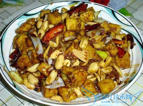 做法:1、先把豆腐切成2厘米见方的小块,用5成热的油炸至金黄色出锅,沥干油待用; 2、花生米用凉水洗净泡一会儿包去红衣,青蒜切花生米大小的段; 3、2勺糖1勺醋2勺番茄酱2勺水1勺酱油调成汁待用; 4、锅中留少些底油,一定要凉油,把辣椒和花生米同时放进锅里慢炒,火要中火,以免把花生米炸糊,要不停的翻炒至金黄色,把豆腐放进锅中炒几下,倒入调好的汁翻炒,上色,放青蒜,盐再炒几下就可以关火出锅了。
