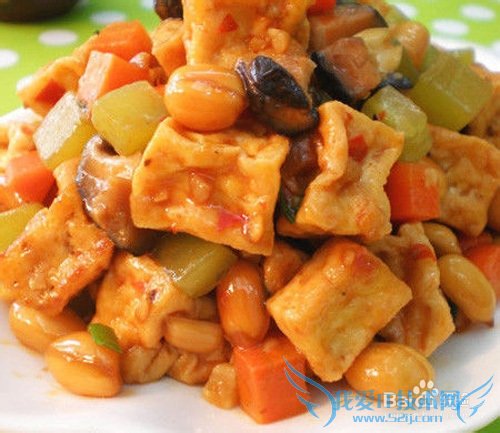 做法:1、起油锅,放入花生米,小火将其炒香后舀出,待晾凉后搓去红衣,待用; 2、老豆腐切方丁,莴笋去皮后洗净切丁,香菇与胡萝卜洗净后切丁;姜蒜切末,豆瓣酱剁碎,葱切花; 3、锅内放入油,待油热后下豆腐丁,将豆腐炸成黄色后捞出沥干油分,待用; 4、锅内留少许的油,下入姜蒜末与郫县豆瓣酱,炒出红油; 5、下入胡萝卜、莴笋、香菇丁,炒匀,放入炸好的豆腐炒匀,加入约50毫升水,放入适量的盐、鸡粉及少许白糖,炒匀后煮约2分钟; 6、下入葱花及生抽炒匀,再放入炒好的花生米,倒入湿淀粉炒匀即可。