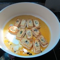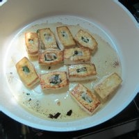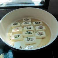 7.不粘锅里放油,依次放进酿好的豆腐。