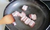 锅中放少许油, 加入五花肉煸炒, 直至油炸煸炒出, 表面微微发黄;