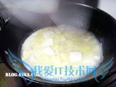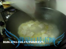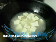 3、轻轻放入切好块的豆腐 4、水开了以后,倒入鸡蛋液