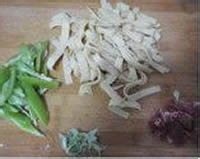 第一步:原料处理,把豆腐皮切成小条,用开水烫一下,烫掉豆腥味;瘦肉切成薄片,用盐腌制10分钟;尖椒切成小块,待用