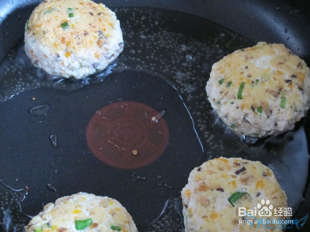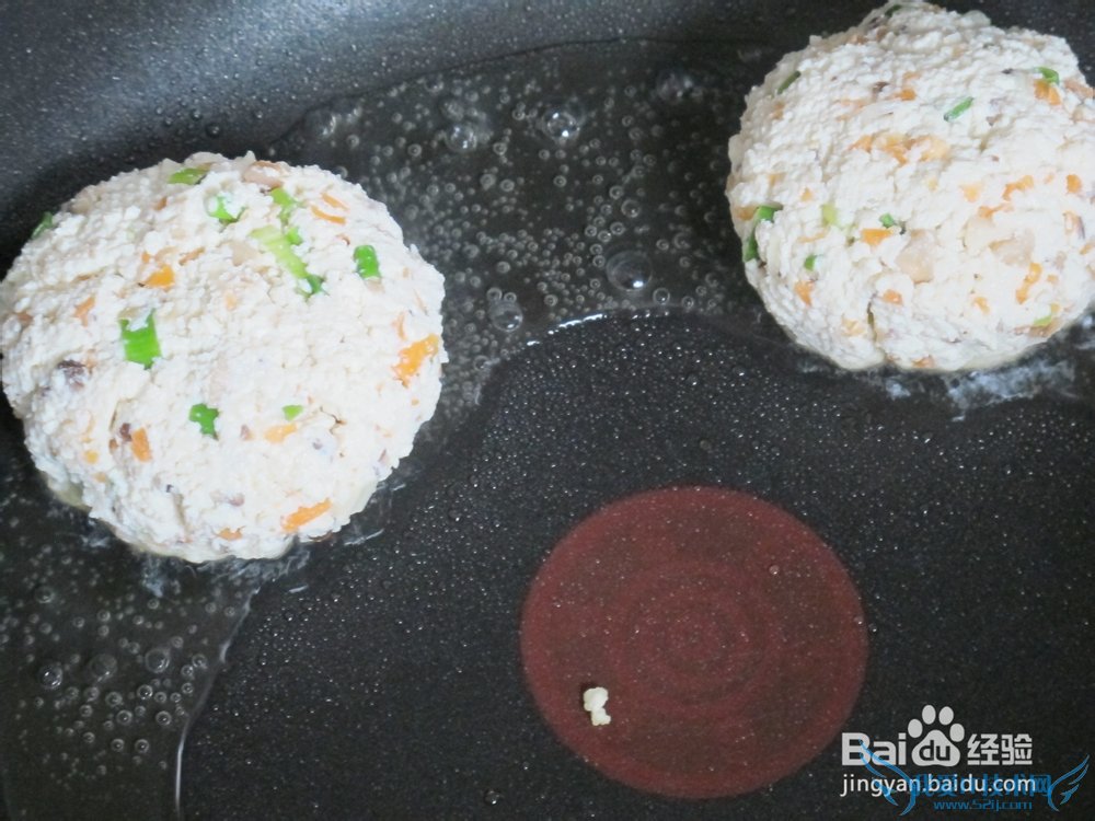 3. 锅内倒入油,大火烧热后转小火,放入捏好形状的豆腐饼