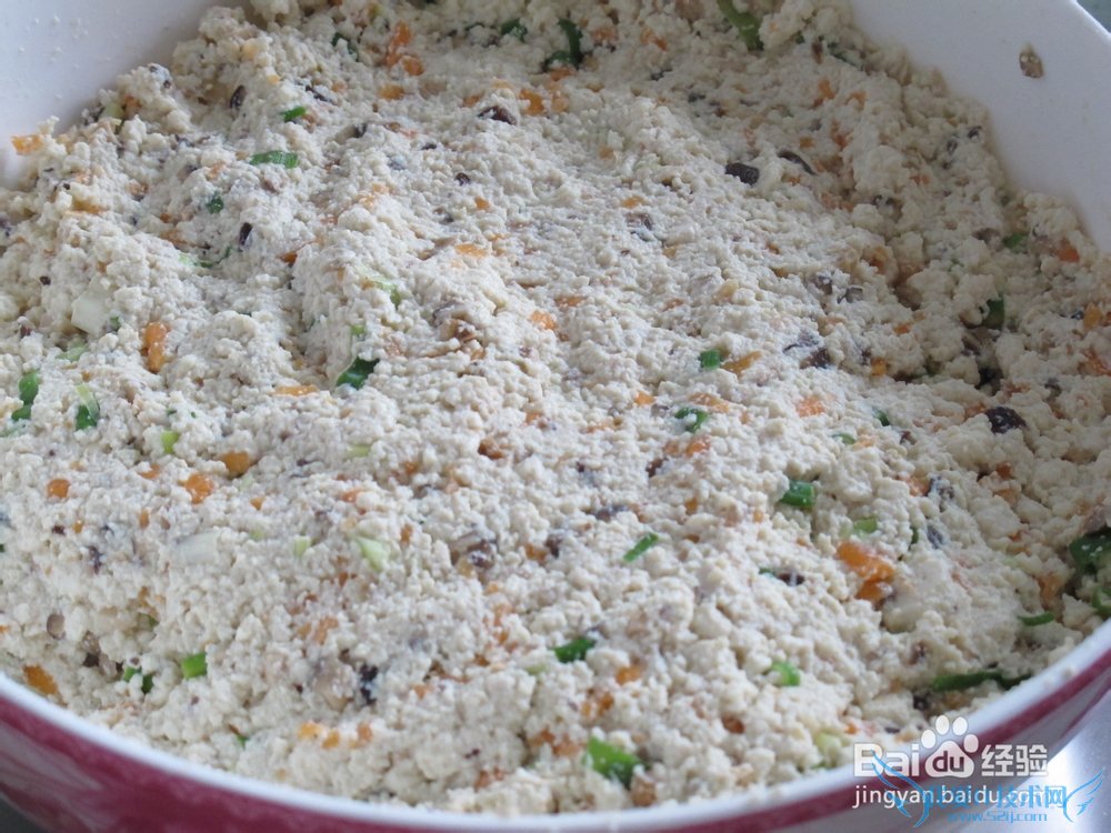 2. 豆腐捏碎,加入切好的香菇、胡萝卜以及葱。加一勺盐,两勺生粉搅拌均匀