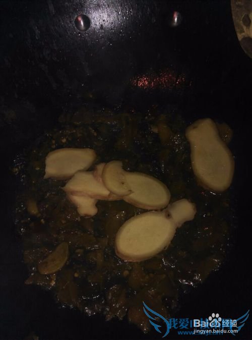 热锅,首先加入油,油温要热,在放入酸菜包,在锅中翻炒,加入生姜,炒得生姜和酸菜炒的有酸菜的香味,在加入水