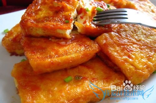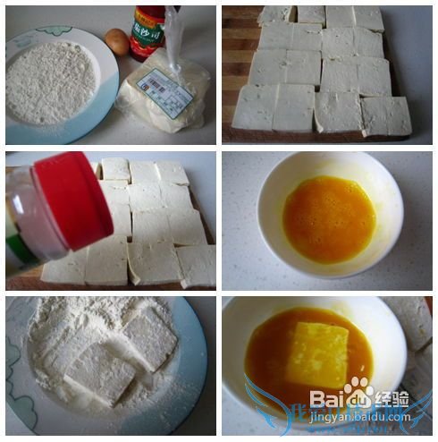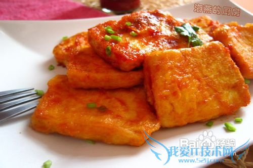 ,一般以盐卤(氯化镁)点制,其特点是硬度较大、韧性较强、含水量较低,口感很“粗”,味微甜略苦,形状稍硬,但是易于煎炸成型,口感外脆里嫩! 选择老豆腐,也就选对了这道菜的主食材,也就等于成功了一半, 接下来就要看它怎么抹粉,穿蛋衣,裹酱了...以下是:海燕的厨房美食<鸡蛋茄汁豆腐>的制作时间==========================【鸡蛋茄汁豆腐】===========================【材料】:主料-老豆一块(300-400克)左右,辅料:面粉100-150克左右,鸡蛋一个,盐少许,番茄沙司2大勺,香菜叶少许【做法】:1,豆腐切成3.5cm长,2cm宽,0.5cm厚的长方形片状 2,豆腐表面撒上细盐,两面都撒,腌制3-5分钟的样子 3,鸡蛋磕入碗内加少许盐调成蛋液待用 4,豆腐片上拍上干面粉,两面都拍,多的要轻轻抖掉一些 5,接着放入蛋液中裹一层,薄薄的一层就可以 8,裹好蛋液的豆腐依次排入平底锅中煎制 9,一面金黄时翻煎另一面,接着调入番茄沙司,2勺左右的量10,拌匀后出锅撒上香菜叶趁热食用