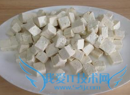 1、备好材料后,豆腐先用盐水泡5分钟,再切成小方块;