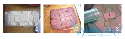 1、 将内脂豆腐从盒中取出,切成长、宽、高均约2厘米的小块。