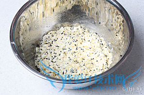 2. 在挤干水分的豆腐里放入鸡蛋,白糖,盐和黑芝麻后搅拌均匀,