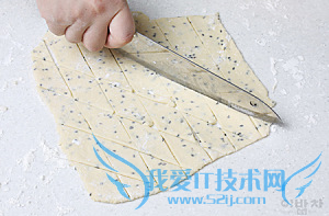 5. 将面团擀成近2毫米的薄饼后,用刀将面饼切成一块块的菱形,