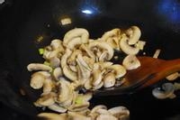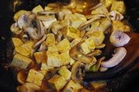 烧热炒锅中油,放入葱花和姜末爆香,加入焯好的蘑菇片翻炒片刻,放入豆腐丁