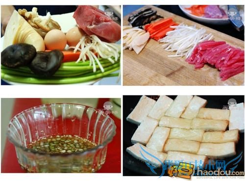 1豆腐沾上干淀粉入油锅两面煎黄;2在一块煎好的豆腐上薄薄的铺上牛肉馅,再其上覆盖一块豆腐,用水芹丝轻轻绑好;3在锅里分别码上以上准备的材料,注意颜色搭配。我家锅小而且不是直口平锅,所以我自作聪明把所有下脚料铺在锅底做垫,这可能也是影响口感的一错误做法。4倒入牛肉汤后大火煮至沸腾转中火煮15分后加入清酱与盐调味即可食用。