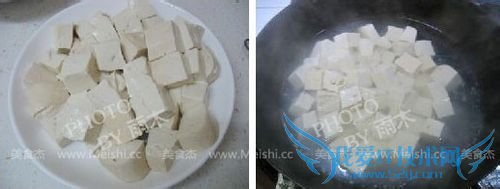 豆腐切成3*3见方的小块;水煮开,下入豆腐块,稍至再开,关火捞出过冷水