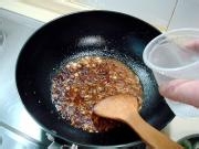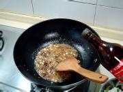 2. 炒勺上火烧热,注入适量烹调油爆香葱姜下入海鲜肉酱煸炒,酱爆香后烹入绍酒炒匀。