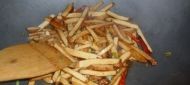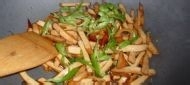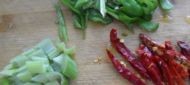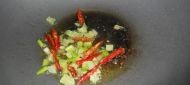 油锅热后,放花椒、葱段和红辣椒丝爆香