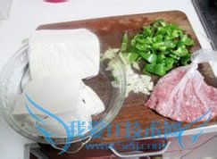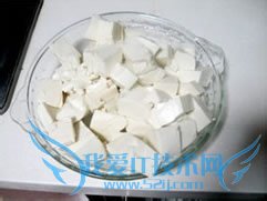 第一步、豆腐的处理,把豆腐切成2CM左右的小方块,然后用开水烫一下,后放入清水浸泡待用。