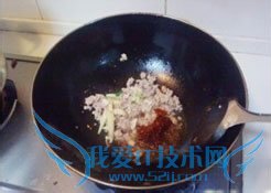 第二步、准备调料,把锅炒热,加油,放入肉馅炒散,后加入豆瓣酱、姜、蒜、葱同炒,最后加入