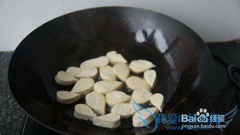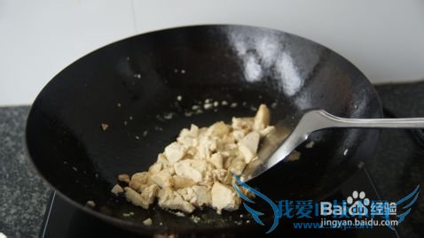 6 锅中另放油,油开后,把剩下的豆腐碎块放入煎锅内,放入少许精盐,生抽,鸡精,