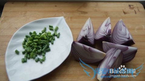 1 把蒜薹切成小细末,圆葱切成相等的六瓣。