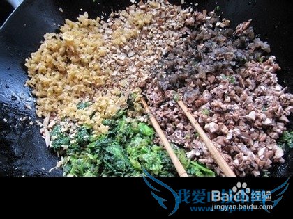 在炒锅里加入植物油,把胡萝卜,柿子椒,白菜,猪肉,葱,蒜,辣椒面,粉条炒熟成馅。
