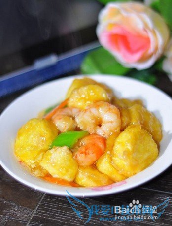 原料: 鲜虾、鸡蛋豆腐(也叫日本豆腐)、玉米、碗豆、番茄沙司。 做法: 1.鲜虾去头、尾、皮,从背部一剖两半,去掉腹部、背部的沙线。放入碗中,加盐、鸡精、淀粉,略腌一会儿。 2.日本豆腐,洗净,从袋中间一切两半,轻轻倒出里面的豆腐,切... >>详细