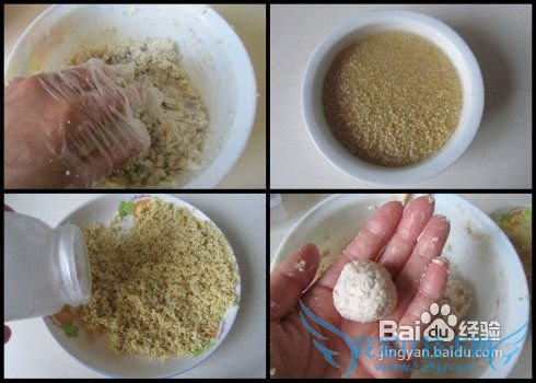 5. 带上一次性手套将它们抓均匀;6. 将小米泡上一至两个小时; 7. 小米控干水分后加入适量的盐调料; 8. 将混合好的虾仁豆腐团成丸子;