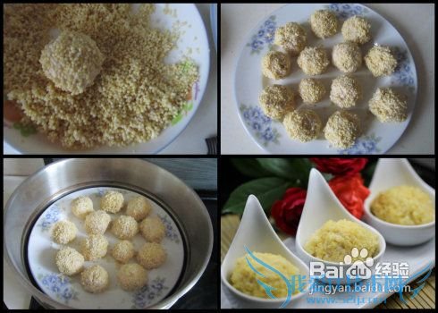 4. 豆腐虾仁泥团成丸子后放入调好味的小米中滚动, 让其表面均匀的裹上一层小米;
