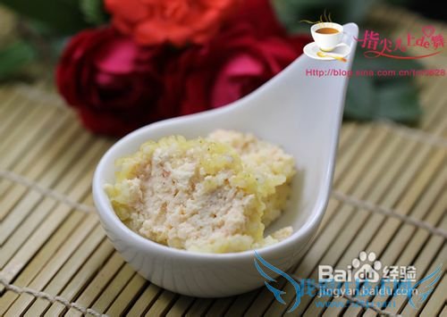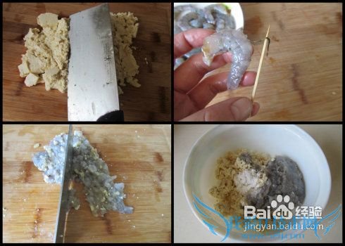 制作:1. 将豆腐用刀背碾碎; 2. 剥去虾壳, 从虾背二, 三节处用牙签将虾线挑出; 3. 将虾仁加入姜一起剁碎; 4. 将豆腐泥和虾泥放入碗中, 加入适量的盐, 料酒,胡椒粉和橄榄油调味;