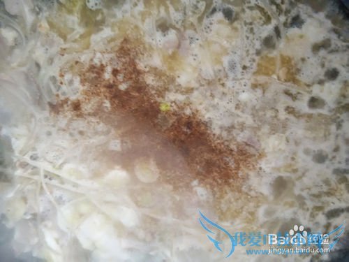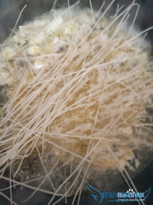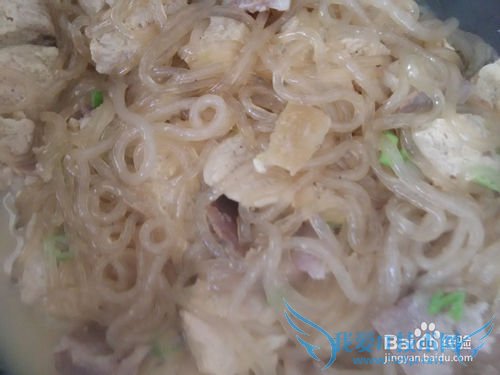 锅里加入洗净的粉条(如图),盖上锅盖待粉条泡软加入花椒面、盐调味。