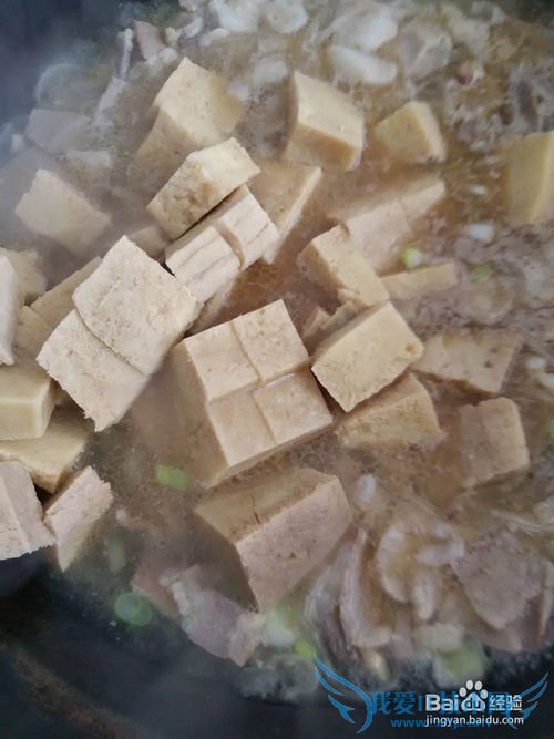 再加入切好的冻豆腐,适当加一些清水要让豆腐都能粘到汤水(如图)。