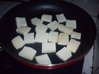 2.煎盘里放少许油,把豆腐煎成两面焦黄。煎的时候可以散些盐。