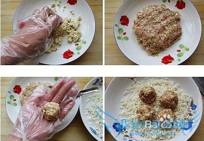 4、用手团一款肉馅,滚成圆形,然后放在糯米里,使肉馅表面粘满糯米粒,取一盘子,盘上刷一层薄油,