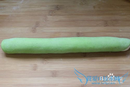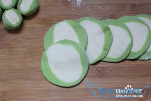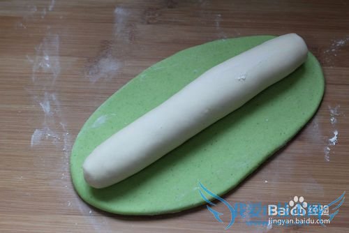 将菠菜面团擀开,白面团揉成圆柱形状。