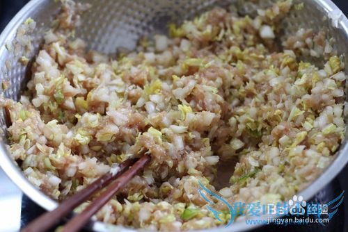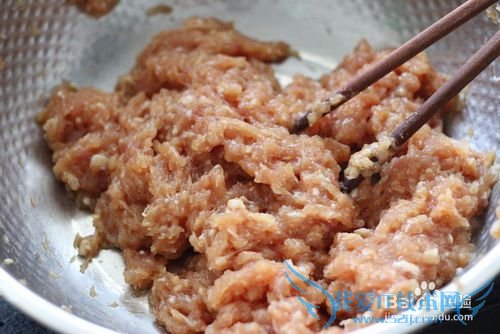 猪肉剁碎,加食盐、酱油、米酒和姜葱末调味,分次加入适量水搅拌上劲。
