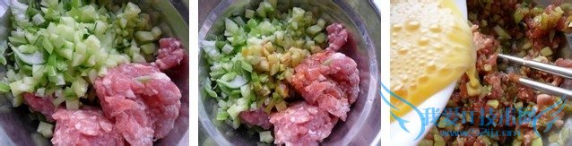 1、黄瓜切成小小的碎丁,和猪肉馅一起放入盆中,加入适量的酱油、盐搅拌均匀后,加入蛋液朝一个方向搅拌上劲。