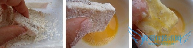 3、把做好的豆腐盒在干面粉中蘸一下,然后再在鸡蛋液中蘸一下,使得豆腐盒上均匀的裹上一层鸡蛋液。