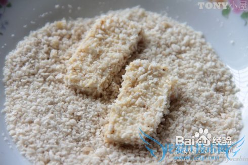 5.面包颗粒在超市都有的卖,其实就是那些剩余的面包烤硬后弄成碎粒。有人会问可不可以用芝麻替换,我觉得还是不行,芝麻一炸就会焦的,或者干脆先沾蛋糊,然后沾上芝麻再沾上面粉油炸,这样也是一个不错的选择。