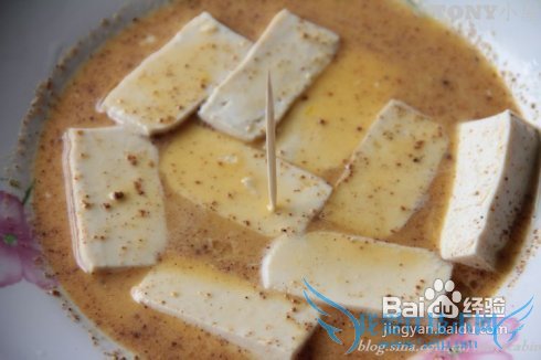 6.为了让豆腐更加入味,可以用牙签在豆腐上插一些小洞。