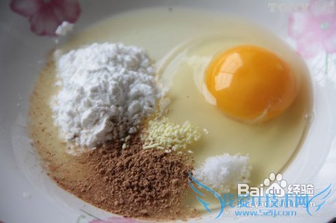 3.鸡蛋里加入十三香粉,盐和鸡精以及面粉后打匀。