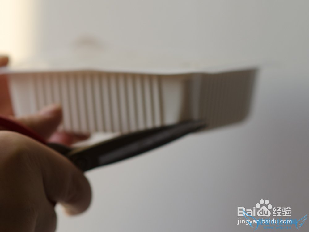 豆腐盒的一角剪开,嘴对着口用力的吹气,