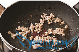 5. 在平底锅里倒入半勺食用油,然后放入猪肉末炒一下,