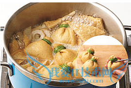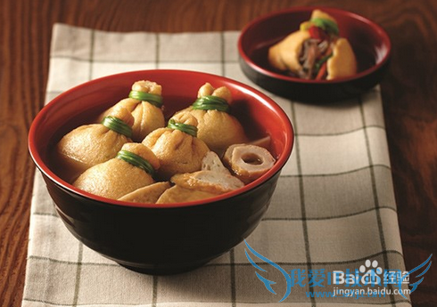 7. 把拌好的馅放到油豆腐里,开口用芹菜捆绑好,和鱼糕一起放入汤里煮3分钟即可。