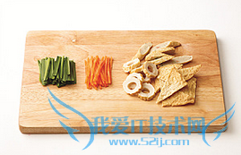 3. 韭菜切成3cm的小段,胡萝卜切成丝,鱼糕切成适当大小,油豆皮切成一半准备做豆腐包,