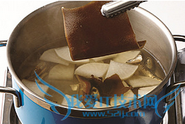 1. 在锅里倒入6杯水,然后放入汤料,用小火煮开后先把海带捞出去,再煮10分钟即可。